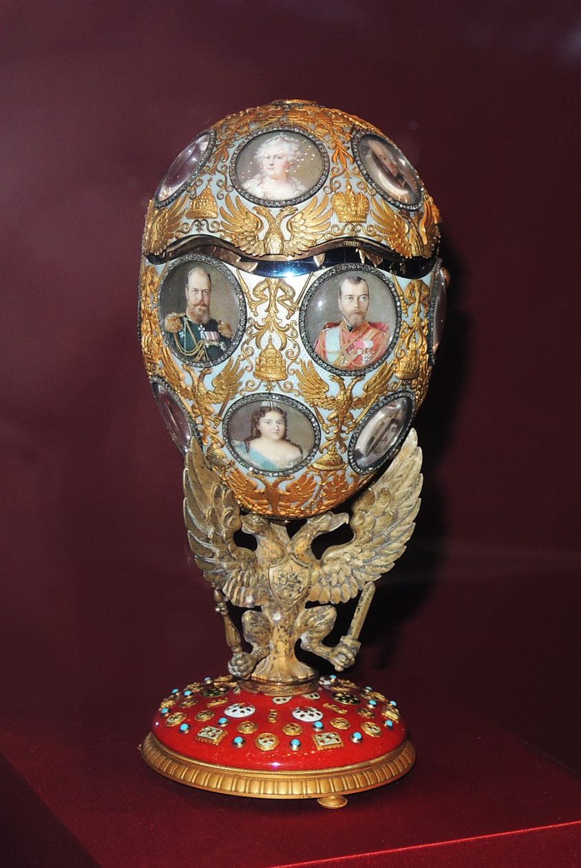 Эмалевое яйцо Фаберже «300-летие дома Романовых» с миниатюрами русских правителей. Поддерживается позолоченным серебряным орлом, стоящим на «щите». Внутри — стальной глобус с обозначенной территорией Российской империи в 1613 и 1913 годах (Оружейная палата, Московский Кремль) / Википедия