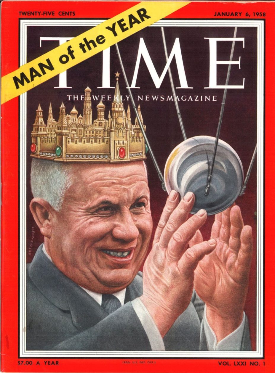 Никита Хрущёв в журнале «Time» с первым спутником в 1958 году / Википедия