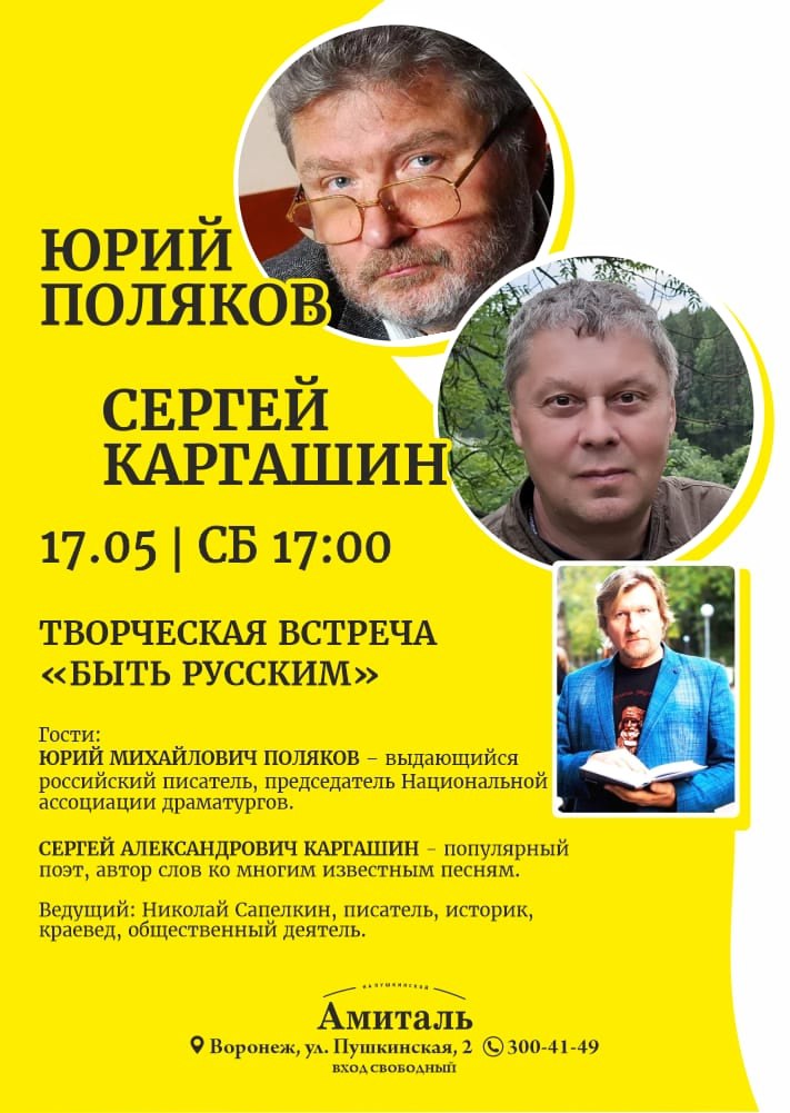 Также в Воронеже в книжном салоне «Амиталь на Пушкинской» состоялась творческая встреча, можно сказать, живого классика писателя Юрия Полякова и вашего покорного слуги с воронежцами. Очень тепло пообщались.